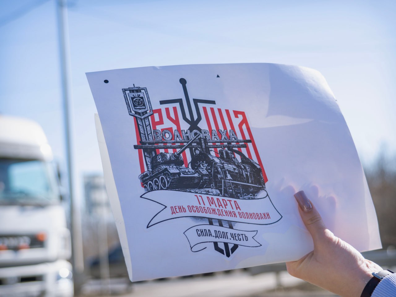 На посту, мимо которого ежедневно проезжают тысячи машин, дружинники и бойцы останавливали водителей и вручали им наклейки с изображением достопримечательностей освобожденного города.