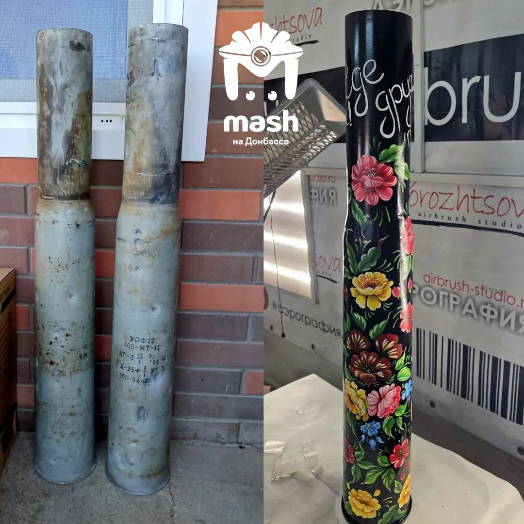 Красоту делала Алёна Ворожцова, говорит, только на жостовскую роспись ушло три дня. Выбоины на металле решили не грунтовать, оставили как есть. Заказчик, который дал ей такой заказ, подарил одну гильзу чиновникам в Ясиноватой, вторую продал за 8к и отправил деньги на гуманитарку. Третья пока ждёт своего часа.