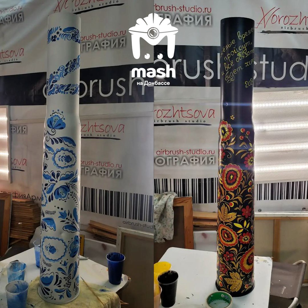 Три стреляные гильзы от пушки "Рапира" расписала в русском народном стиле художница из Армавира. Одна теперь стоит в администрации Ясиноватой.