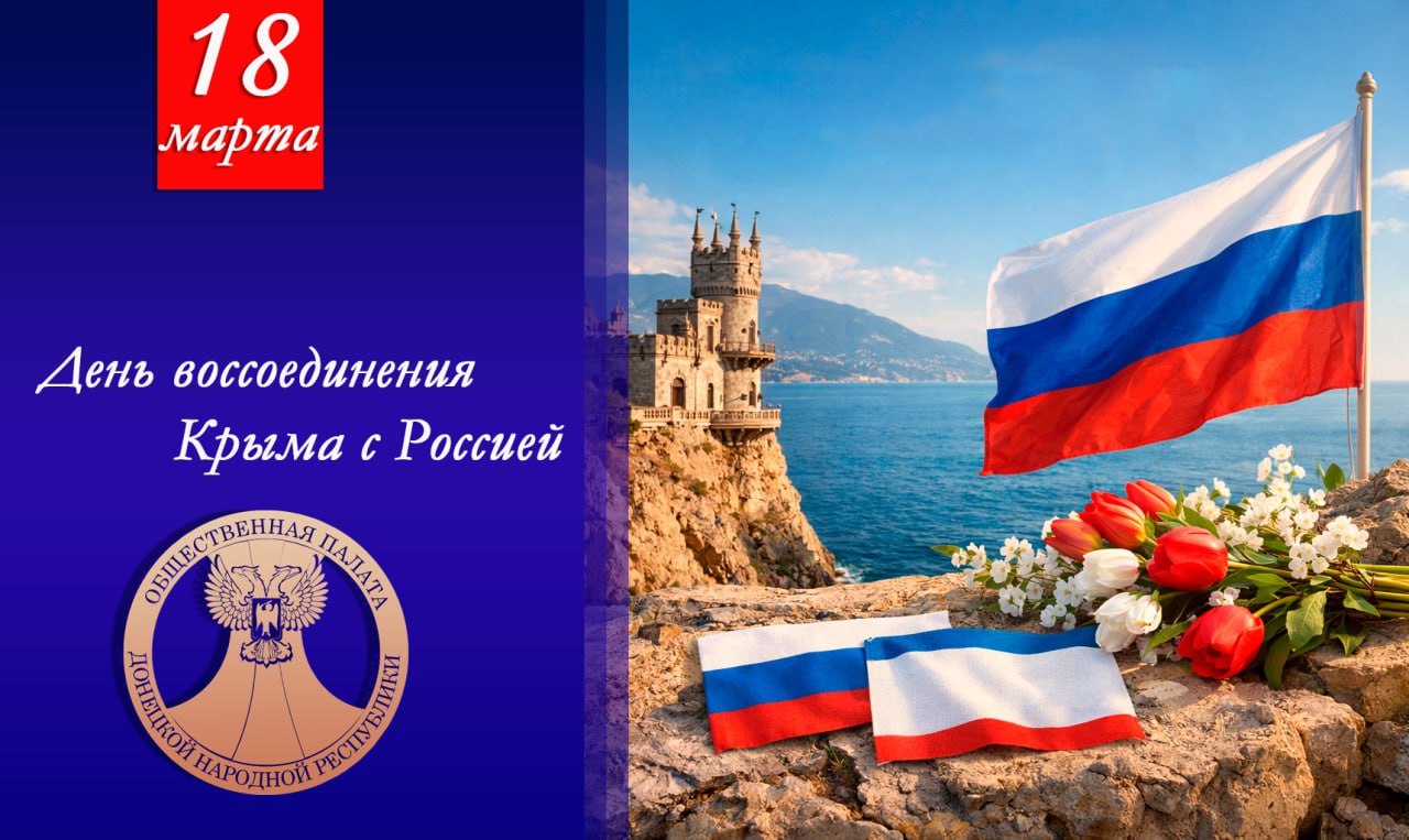 От имени Общественной палаты Донецкой Народной Республики поздравляю всех крымчан с этим великим праздником! Желаю процветания, благополучия и мира вашему прекрасному полуострову. Пусть российский флаг, развевающийся над Крымом, всегда напоминает о том, что справедливость восторжествовала, а единство – наша главная сила.
