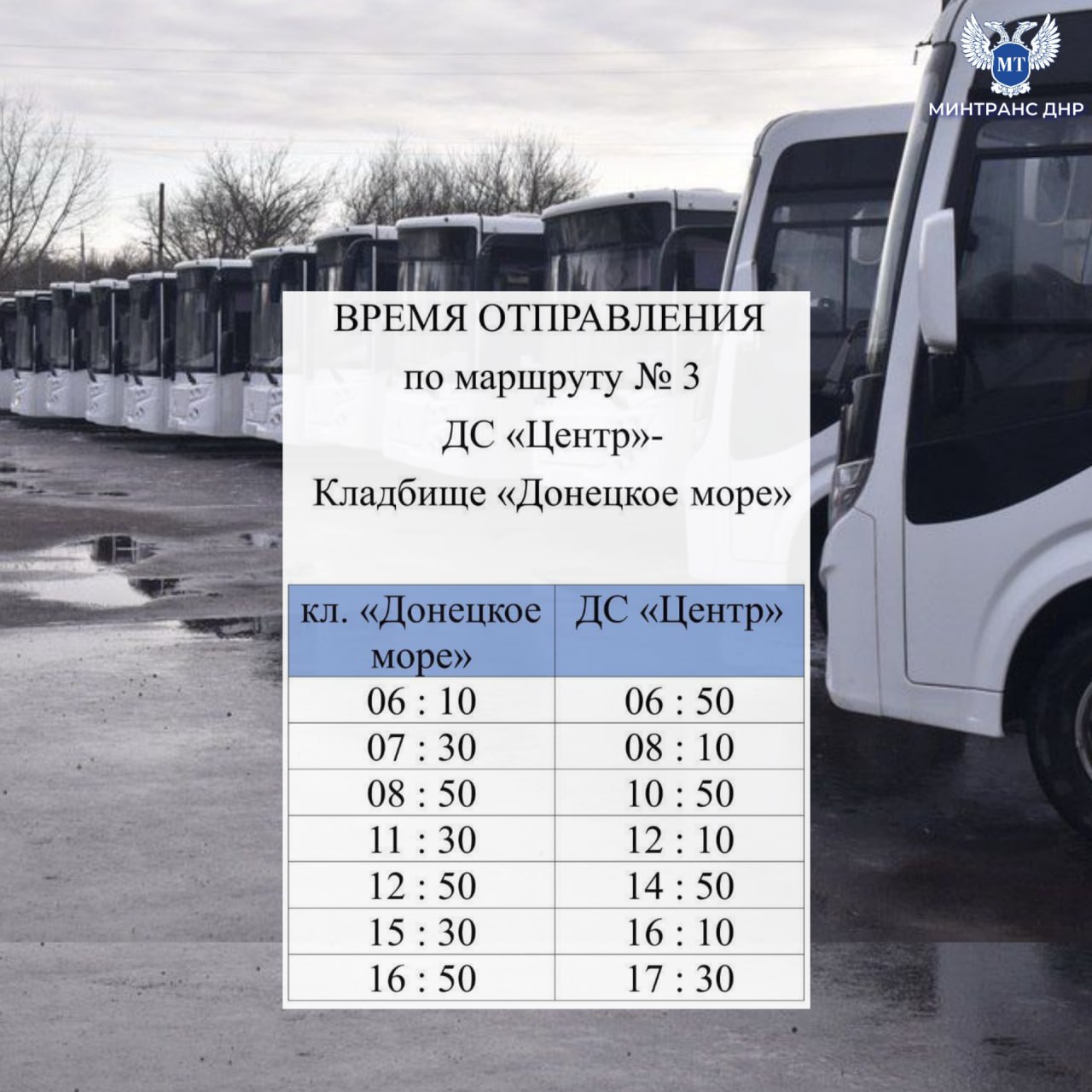 Начиная с 20 марта обслуживание муниципального маршрута № 3 "ДС "Центр" - Кладбище "Донецкое море " города Донецка осуществляет государственное предприятие ГУП ДНР "ДОНБАССКАЯ ТРАНСПОРТНАЯ КОМПАНИЯ".