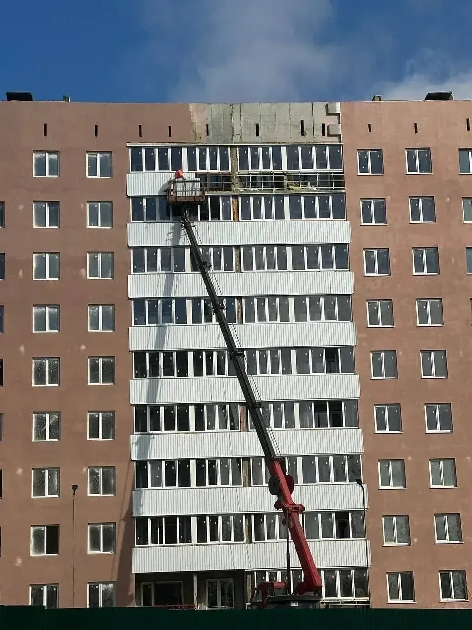 Фасадчики завершают обшивку экранов лоджий профлистом.