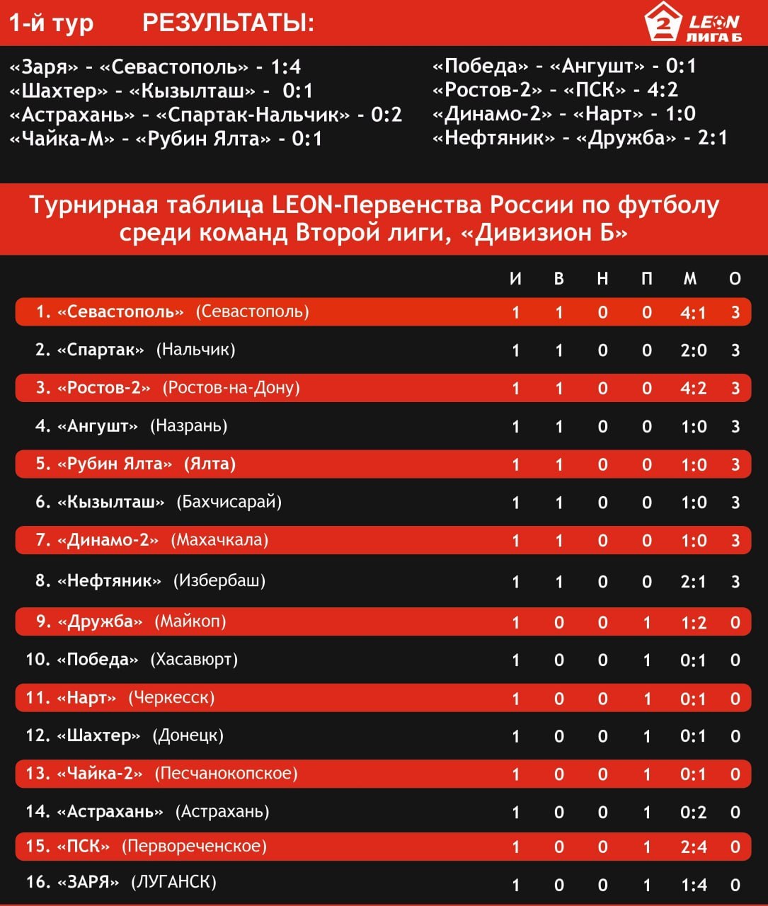 По итогам первого тура лидирует команда “Севастополь”. На втором месте – “Ростов 2”, на третьем – “Ангушт” (Назрань). Команда “Кызылташ” занимает 6-ю строчку. В аутсайдерах оказалась луганская “Заря”. Она замыкает турнирную таблицу на 16-м месте.