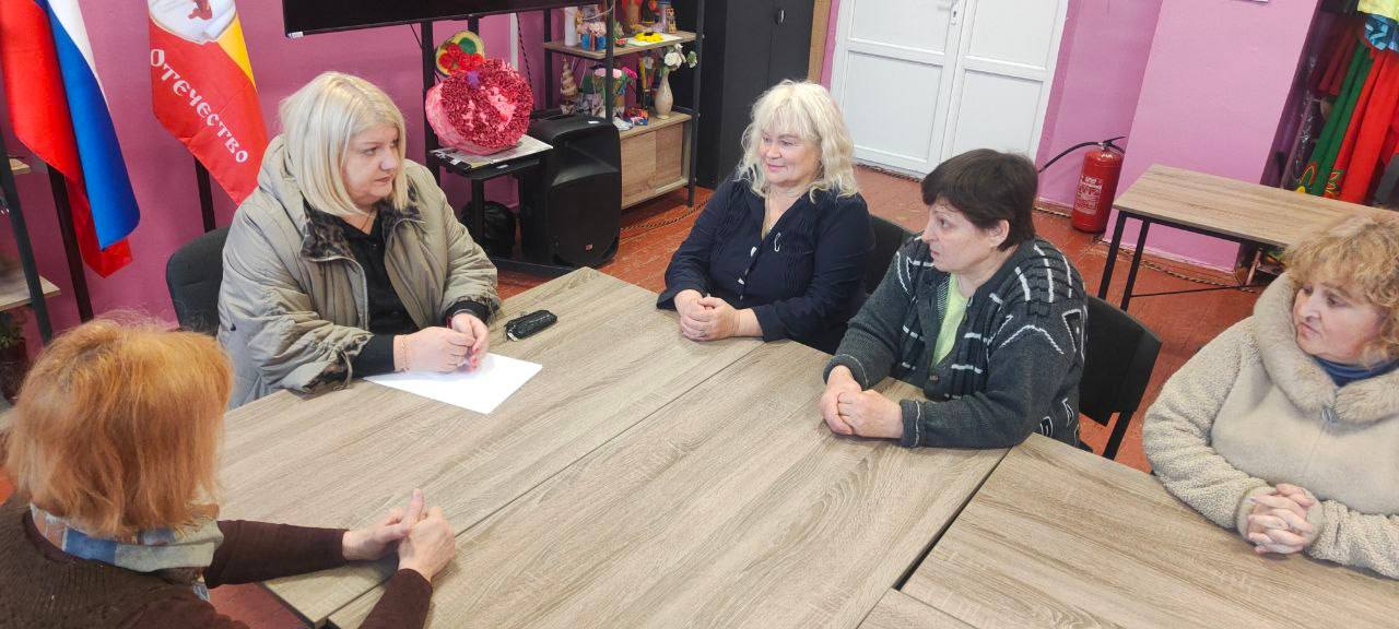 Сегодня заведующий Мирненским территориальным сектором Администрации Тельмановского округа провела встречу с трудовым коллективом Мирненского дома культуры в пгт. Мирное.
