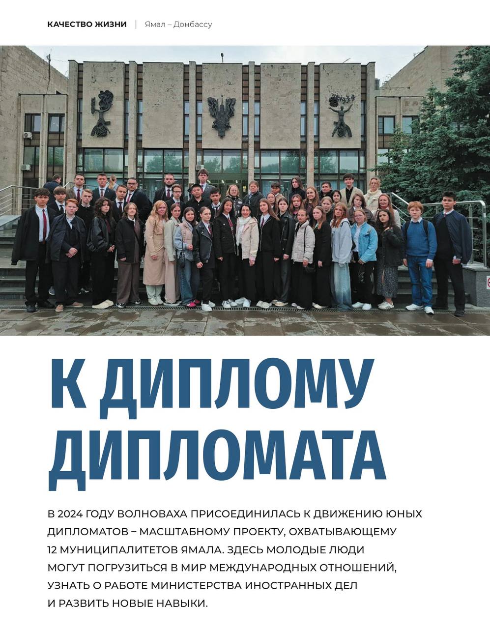 Волноваха всё активнее включается в ямальские образовательные проекты, которые открывают подросткам новые горизонты. В журнале «Ямальский меридиан» вышел материал о том, как в округе развивается движение юных дипломатов и какие возможности оно даёт школьникам — от знакомства с международной повесткой до практических навыков коммуникации и поступления в вузы.