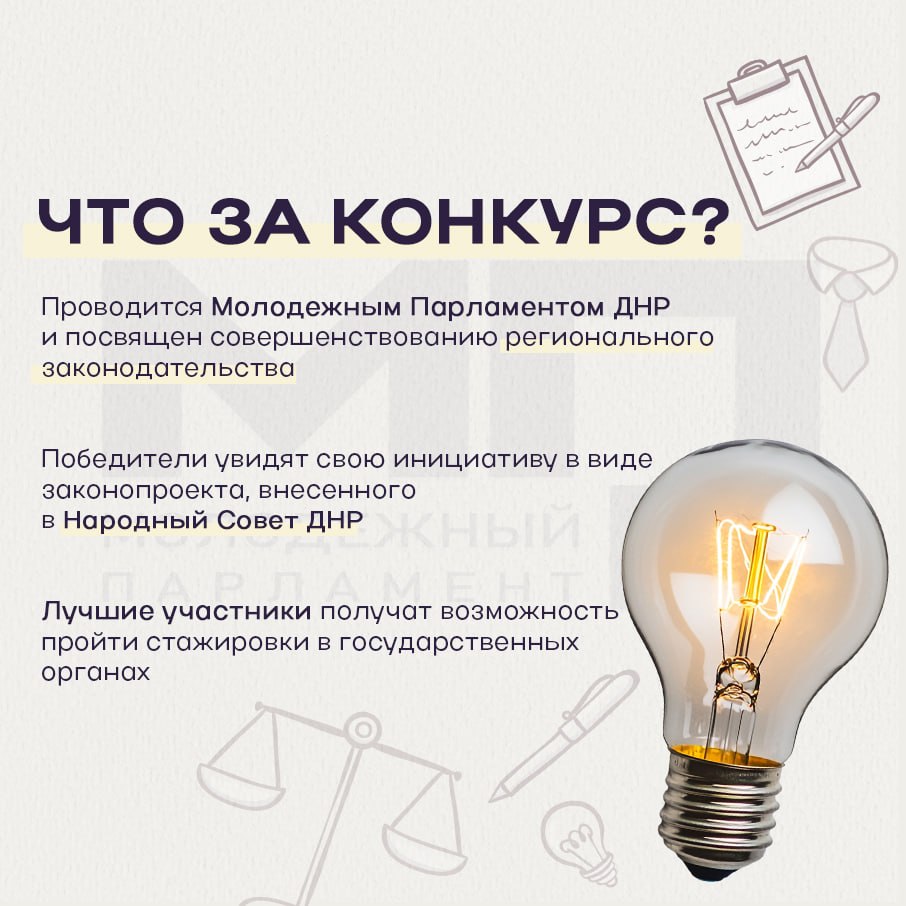 Это шанс для тех, кто хочет реально повлиять на жизнь своего региона. Вы можете предложить изменения в действующее законодательство ДНР или выступить с идеей принятия нового республиканского закона.