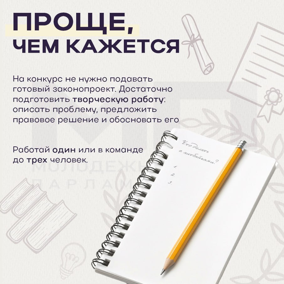 И главное: не нужен готовый законопроект со сложной юридической структурой. Достаточно представить творческую работу — концепцию, в которой вы опишете проблему и предложите правовой механизм ее решения.