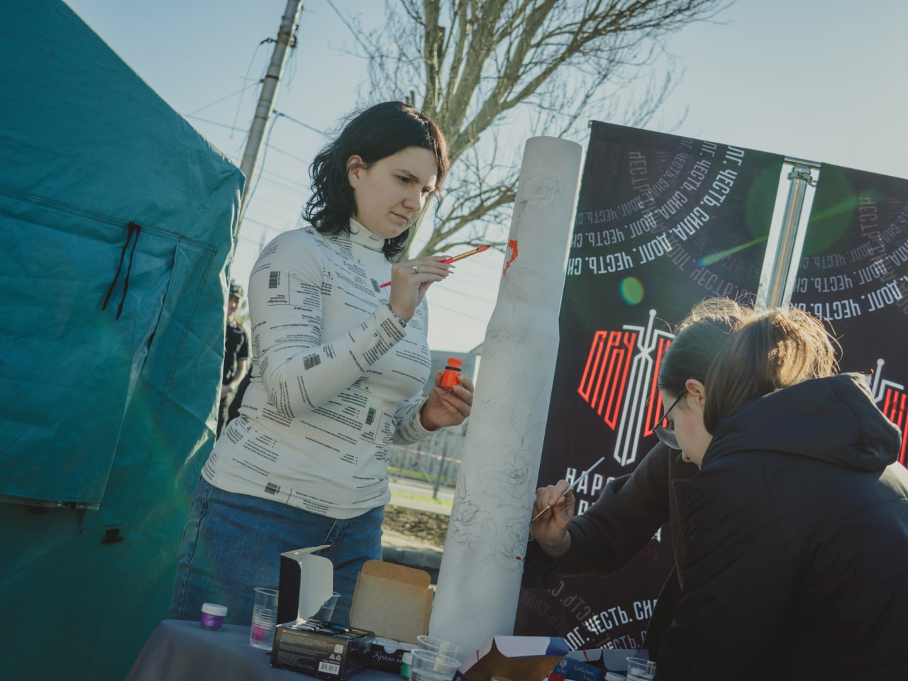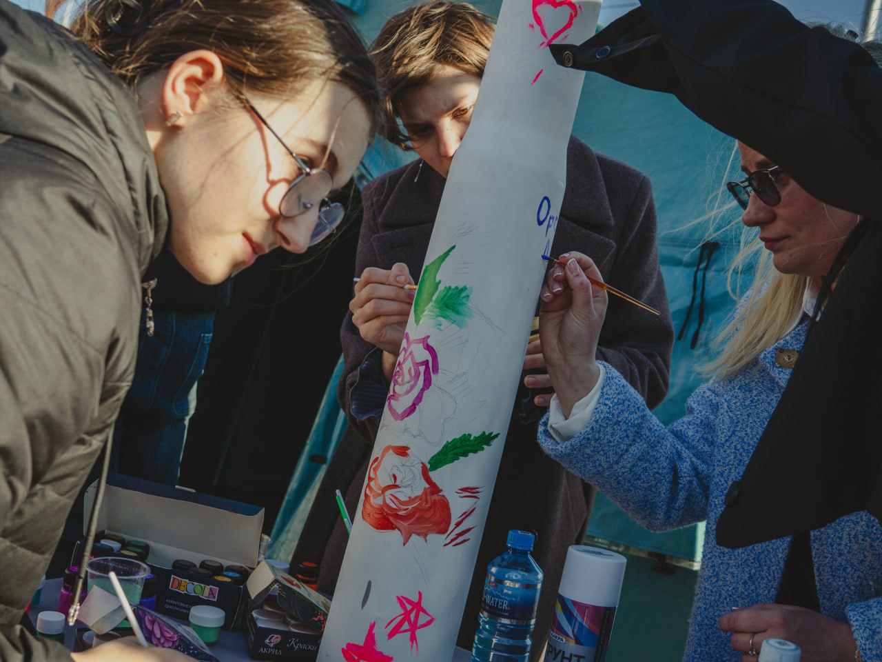После школы еще одна гильза отправилась на фестиваль от РОО «Народная Дружина». Там к созданию на ней рисунка присоединились из разных организаций — вышло очень ярко и разнообразно.