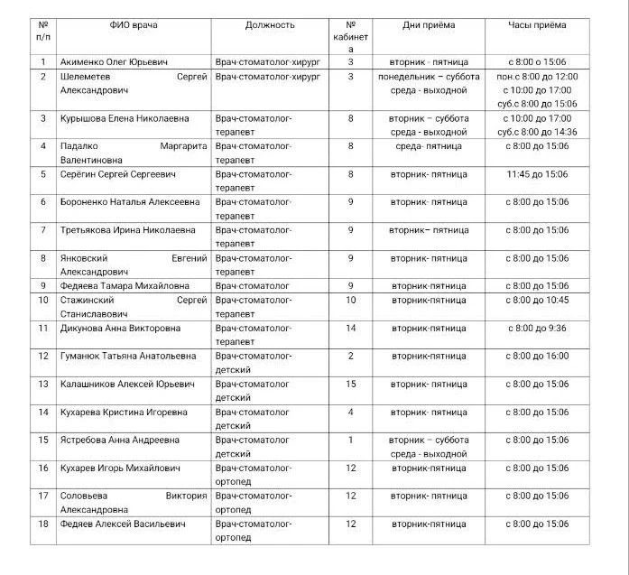 График работы врачей ГБУ ДНР «Городская стоматологическая поликлиника г. Снежное» с 13.04.2026 по 19.04.2026