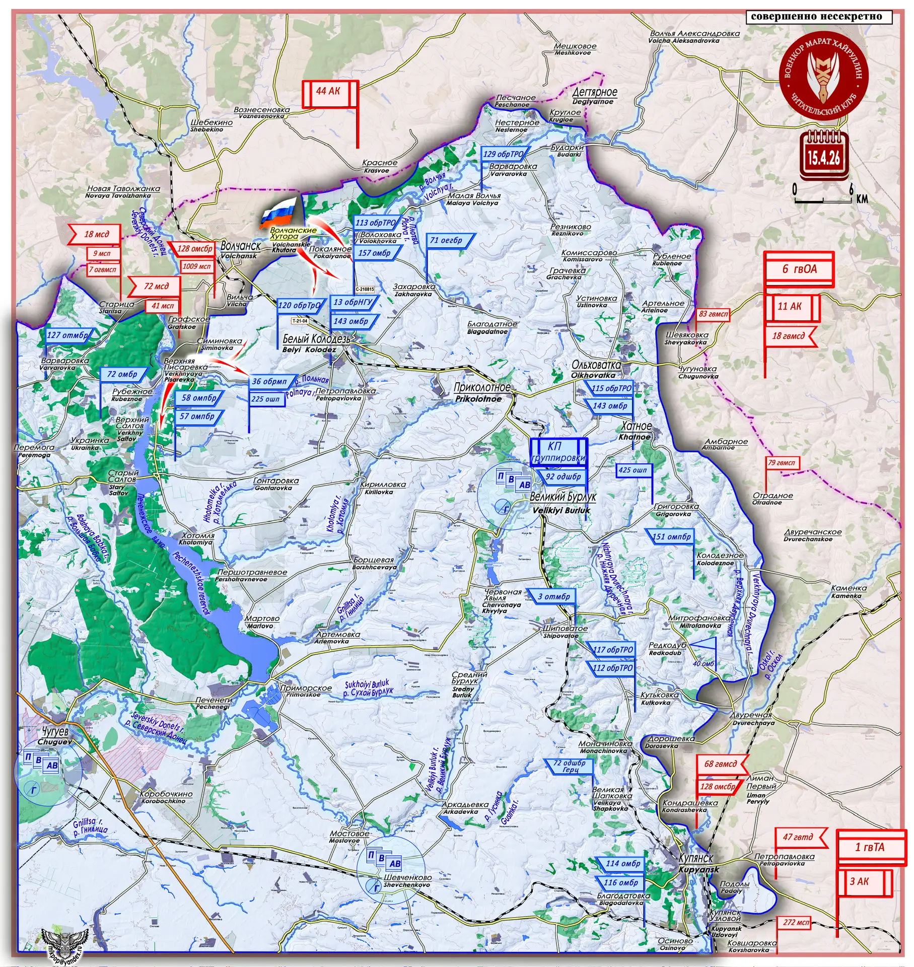 15 апреля было освобождено большое село Волчанские Хутора (50°1804 с. ш. 37°0158 в. д. - население 1337 чел. в 2001 г.).