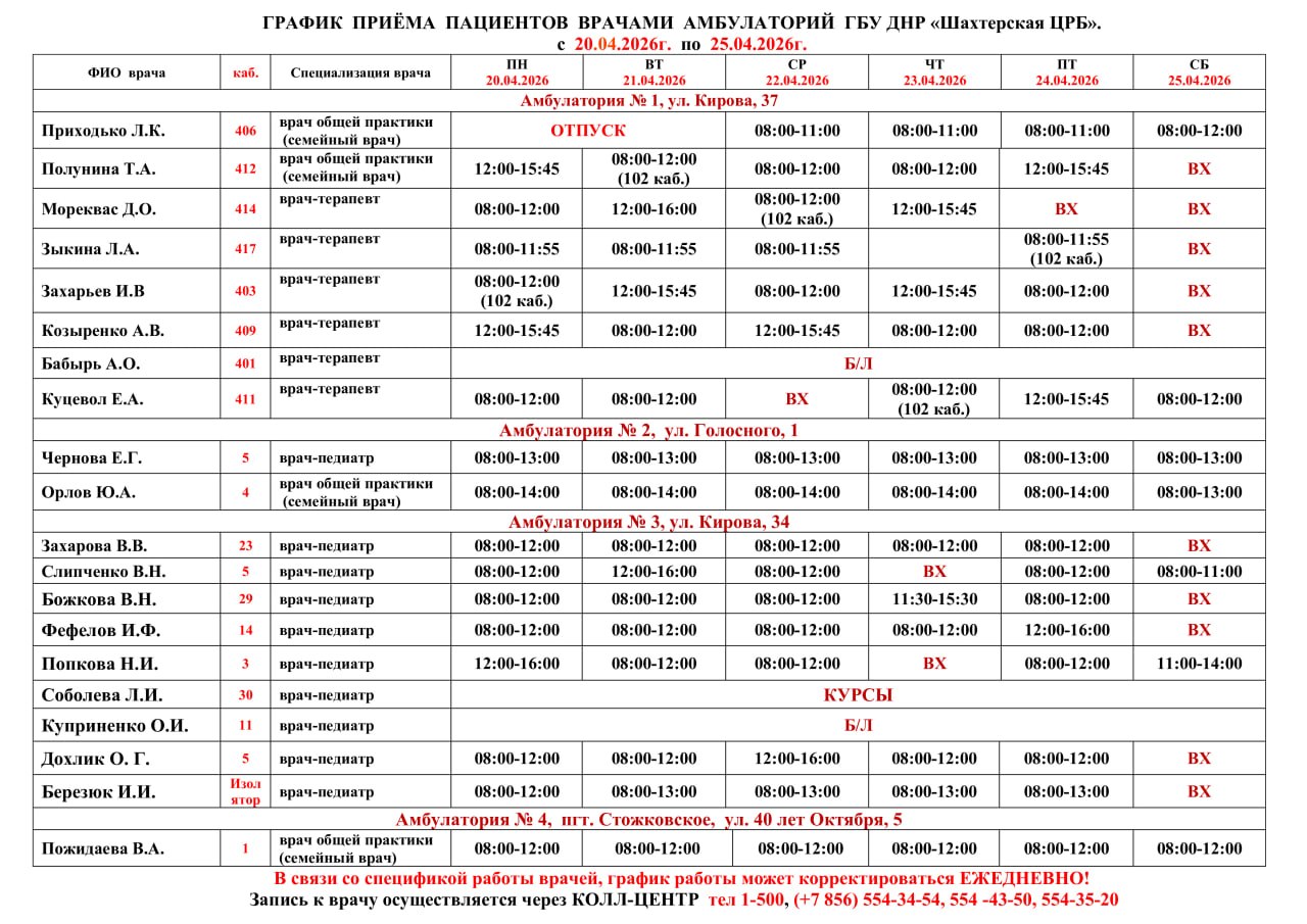 График приема врачами С 20.04.2026 по 25.04.2026
