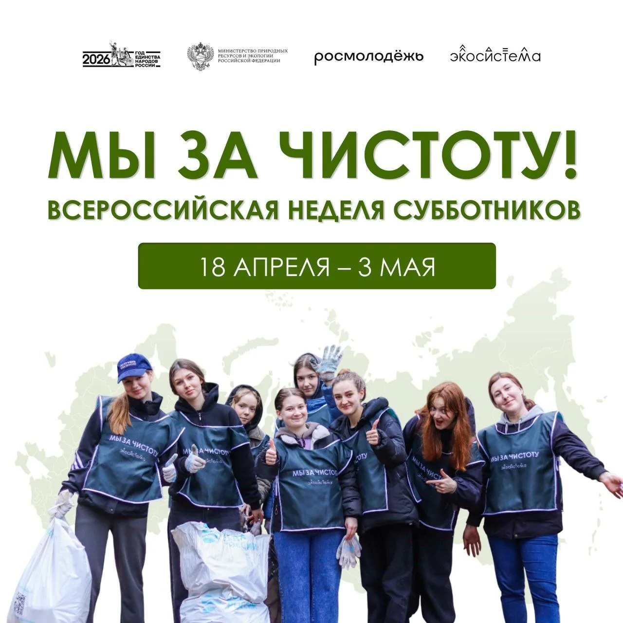 Всероссийская неделя субботников «Мы за чистоту» пройдет с 18 апреля по 3 мая 2026 года в рамках национального проекта «Экологическое благополучие» и при поддержке проекта «Молодежь и дети».