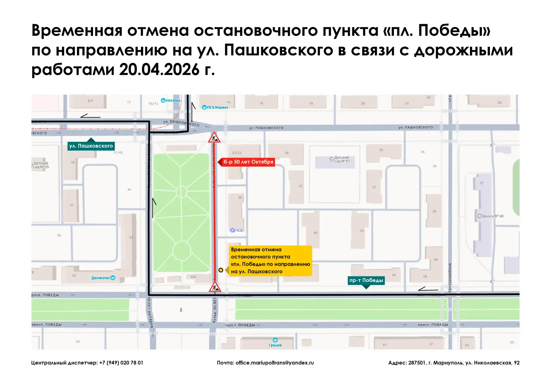 Информируем, что 20.04.2026 г. в связи с дорожными работами на б-р 50 лет Октября, остановочный пункт «пл. Победы» по направлению на ул. Пашковского временно отменяется.