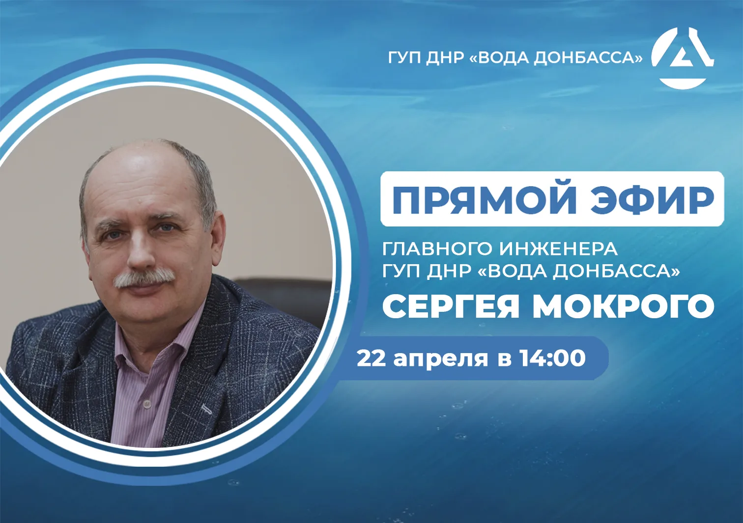 В среду, 22 апреля, в 14:00, по поручению Главы ДНР главный инженер предприятия «Вода Донбасса» Сергей Мокрый проведет прямой эфир, в ходе которого ответит на вопросы жителей Республики.
