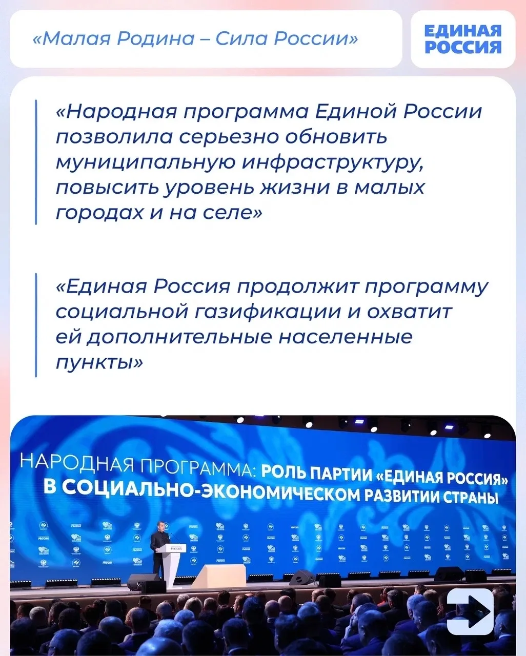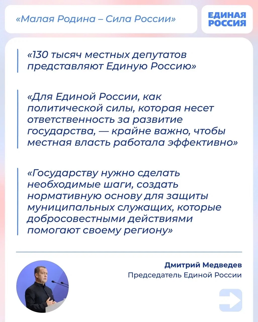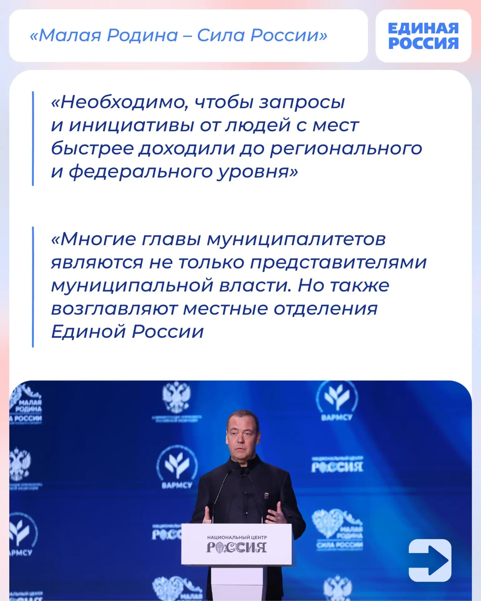 Председатель Единой России, зампредседателя Совбеза РФ Дмитрий Медведев выступил на III всероссийском муниципальном форуме «Малая Родина — сила России».