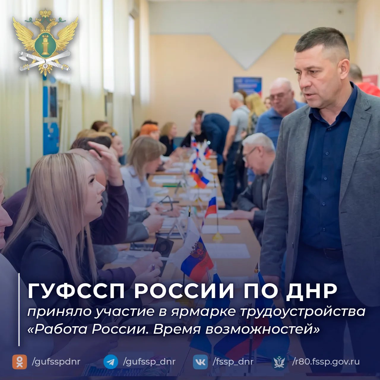 «Ярмарка трудоустройства — это отличная возможность для граждан найти работу по душе, а для нас — привлечь в службу мотивированных и ответственных специалистов. Мы всегда рады видеть в своих рядах тех, кто готов посвятить себя защите закона», — отметили в ГУФССП России по Донецкой Народной Республике.