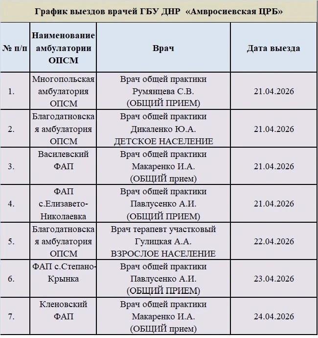 График приема врачей поликлинического отделения ГБУ ДНР "Амвросиевская ЦРБ", для уточнения информации, обращайтесь в регистратуру поликлиники по тел