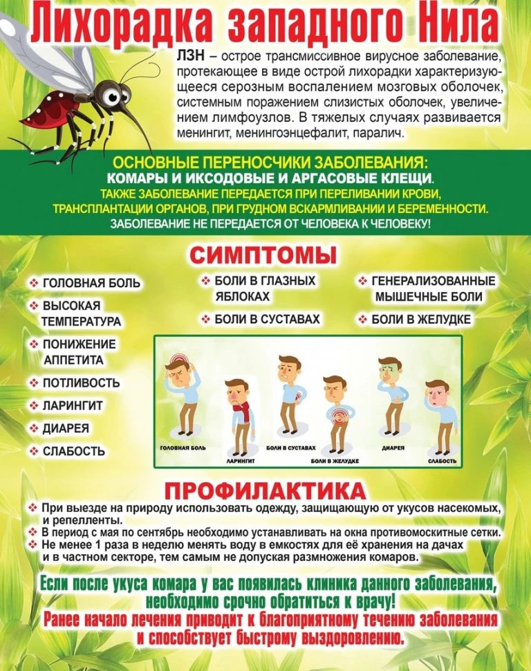 Лихорадка Западного Нила (ЛЗН) – это вирусное заболевание, переносимое комарами и иксодовыми клещами.