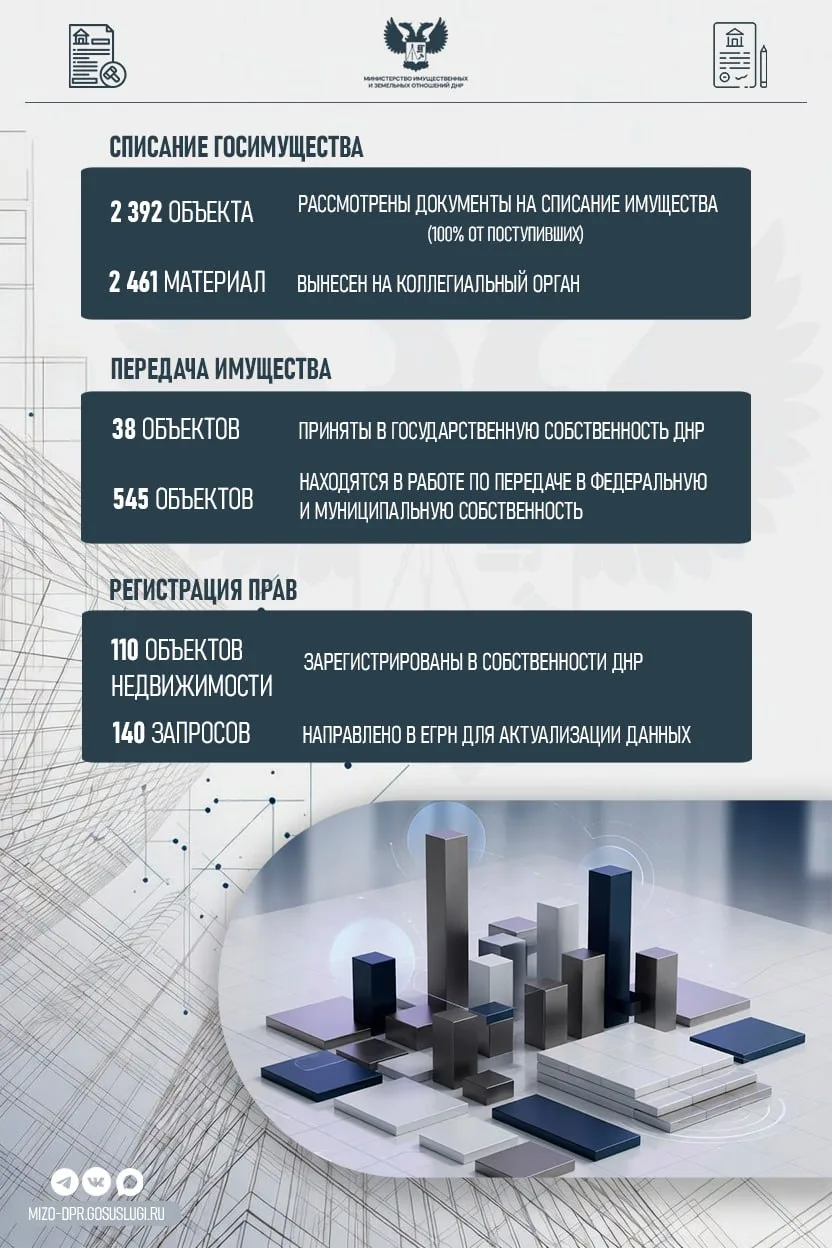 За I квартал 2026 года Министерством имущественных и земельных отношений ДНР обеспечена системная работа с государственным имуществом по всем ключевым направлениям: от оформления прав собственности до вовлечения имущества в хозяйственный оборот.