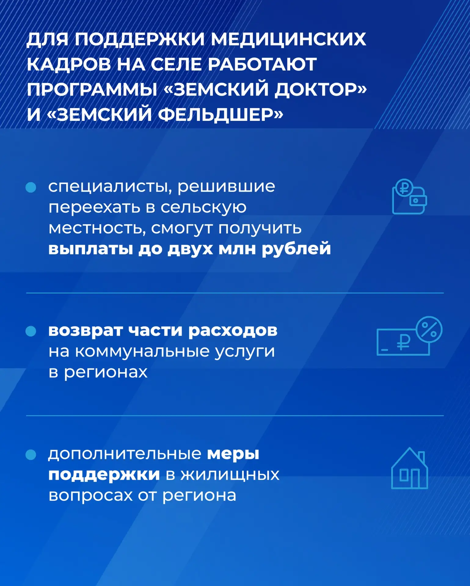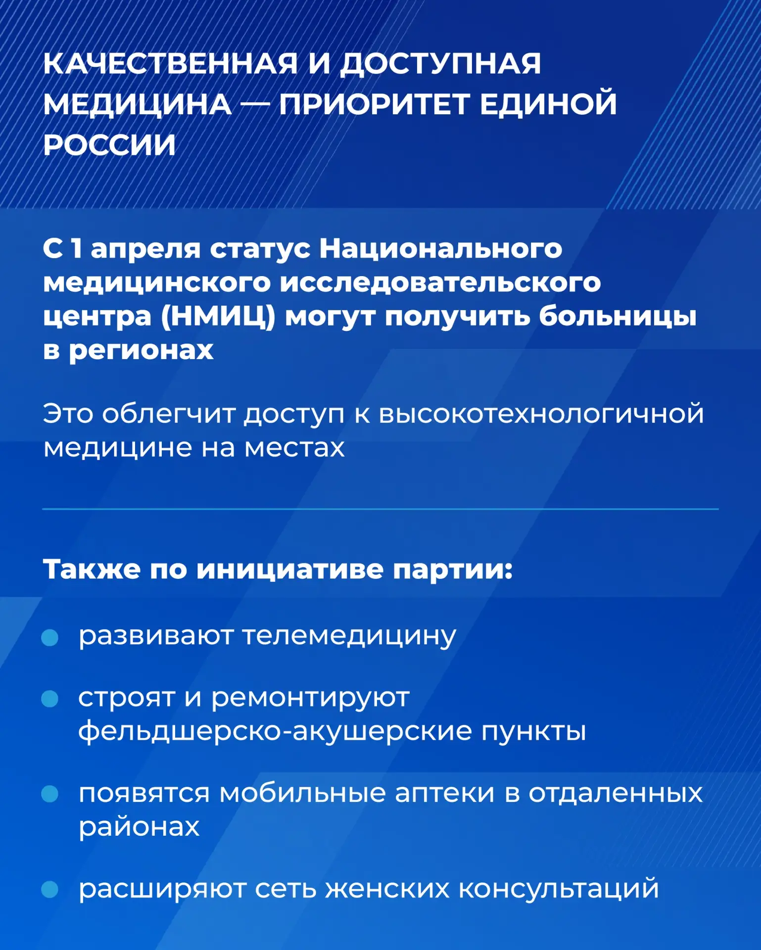 Для того, чтобы каждый житель страны мог проверить свое здоровье и получить необходимую помощь, по народной программе Единой России строят новые и ремонтируют существующие фельдшерско-акушерские пункты, поликлиники и больницы. Создают цифровые сервисы, поддерживают профессиональные кадры, развивают медицинскую инфраструктуру.