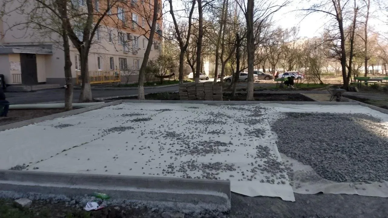 На придомовой территории строители ведут устройство несущего слоя и уплотнение основания.