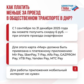 Чтобы получить скидку 6 рублей, нужно расплатиться в автобусах с валидаторами смартфоном, на котором установлен один из платежных сервисов: Mir Pay, SberPay, T-Pay, Alfa Pay, GAZPROM Pay, VTB Pay, Yandex Pay, МТС Pay.В течение месяца в...