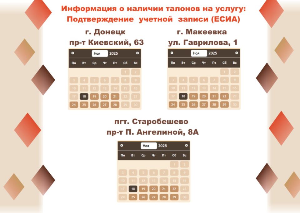 Информацию о доступных талонах на получение необходимых услуг в отделениях МФЦ можно найти в карточкахПеред посещением МФЦ проверьте наличие свободных талонов на Портале ГБУ "МФЦ ДНР".