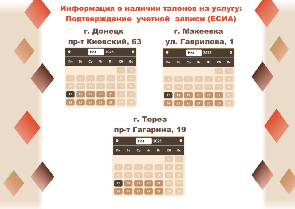 Информацию о доступных талонах на получение необходимых услуг в отделениях МФЦ можно найти в карточкахПеред посещением МФЦ проверьте наличие свободных талонов на Портале ГБУ "МФЦ ДНР".