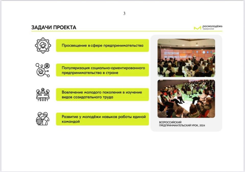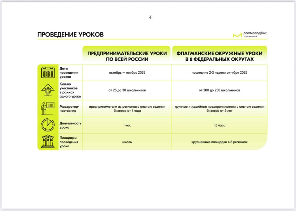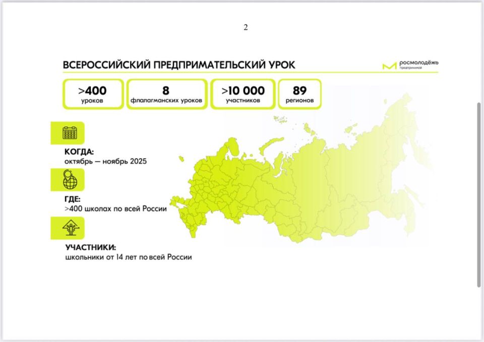 В рамках Всероссийской программы по развитию молодежного предпринимательства, с октября по ноябрь 2025 года в регионах России пройдет проект «Всероссийский предпринимательский урок».