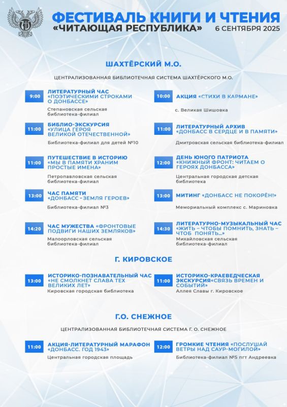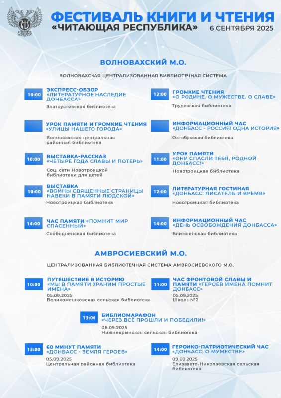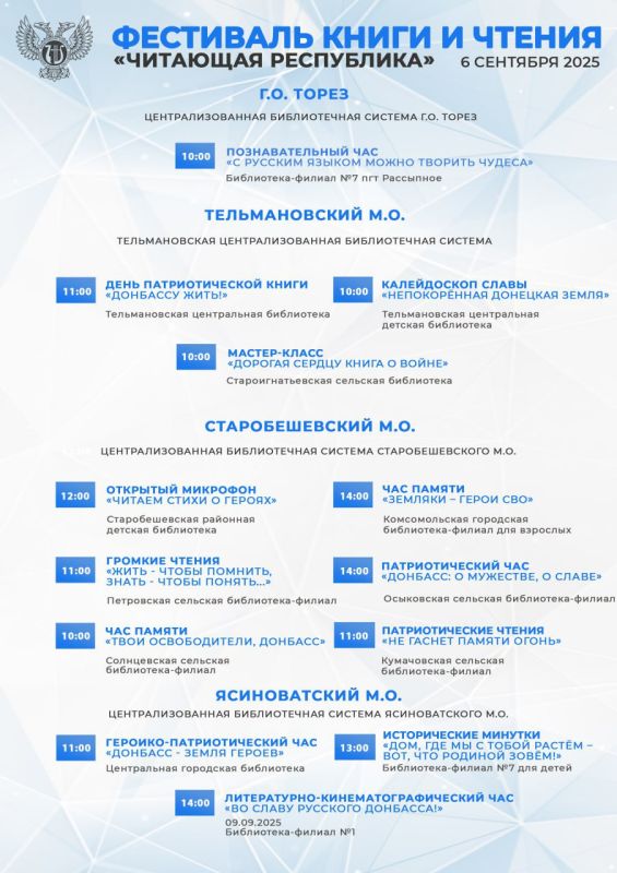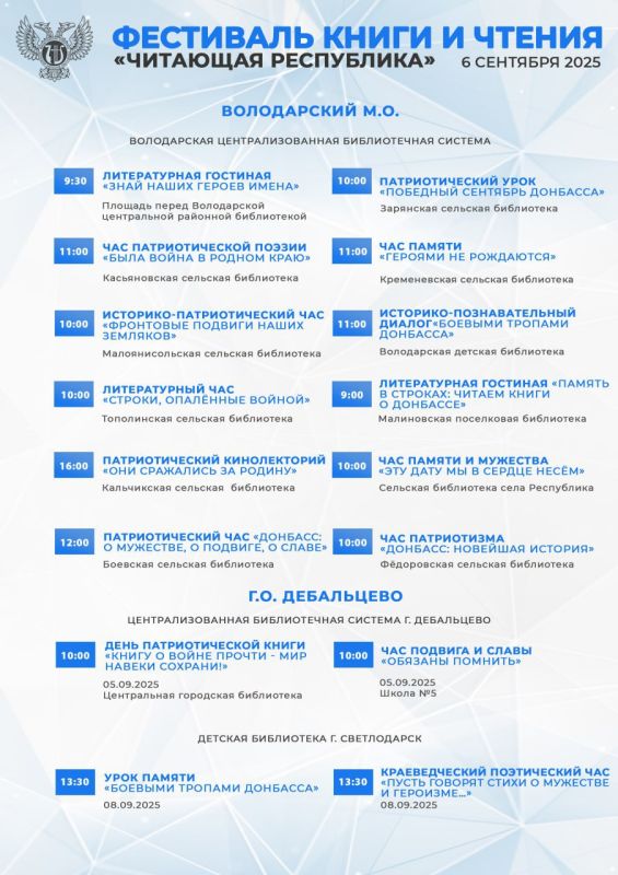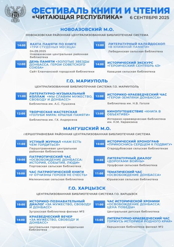 В этом году Фестиваль посвящён Дню освобождению Донбасса от немецко-фашистских захватчиков и Году защитника Отечества. Читатели смогут стать участниками различных литературных мероприятий – викторин, мастер-классов, игр, патриотических часов, кинолекториев, театрализованных чтений, акций и экскурсий.