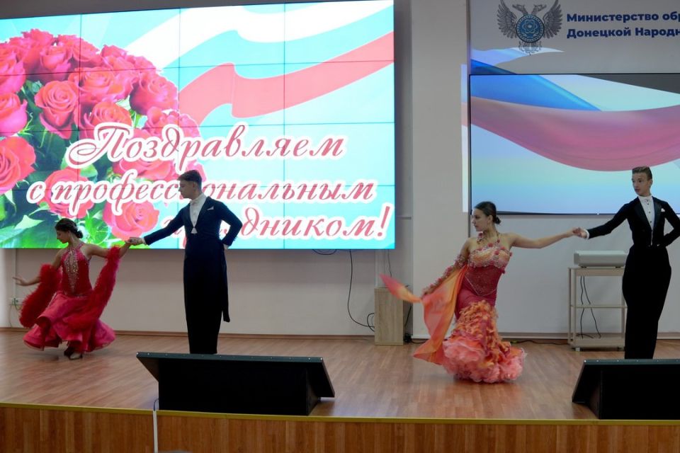Министр образования и науки Олег Трофимов, заместитель Виталий Пестрецов и Председатель Региональной организации Профсоюза работников народного образования и науки Российской Федерации в ДНР Ася Горшкова поздравили собравшихся с Днем учителя.