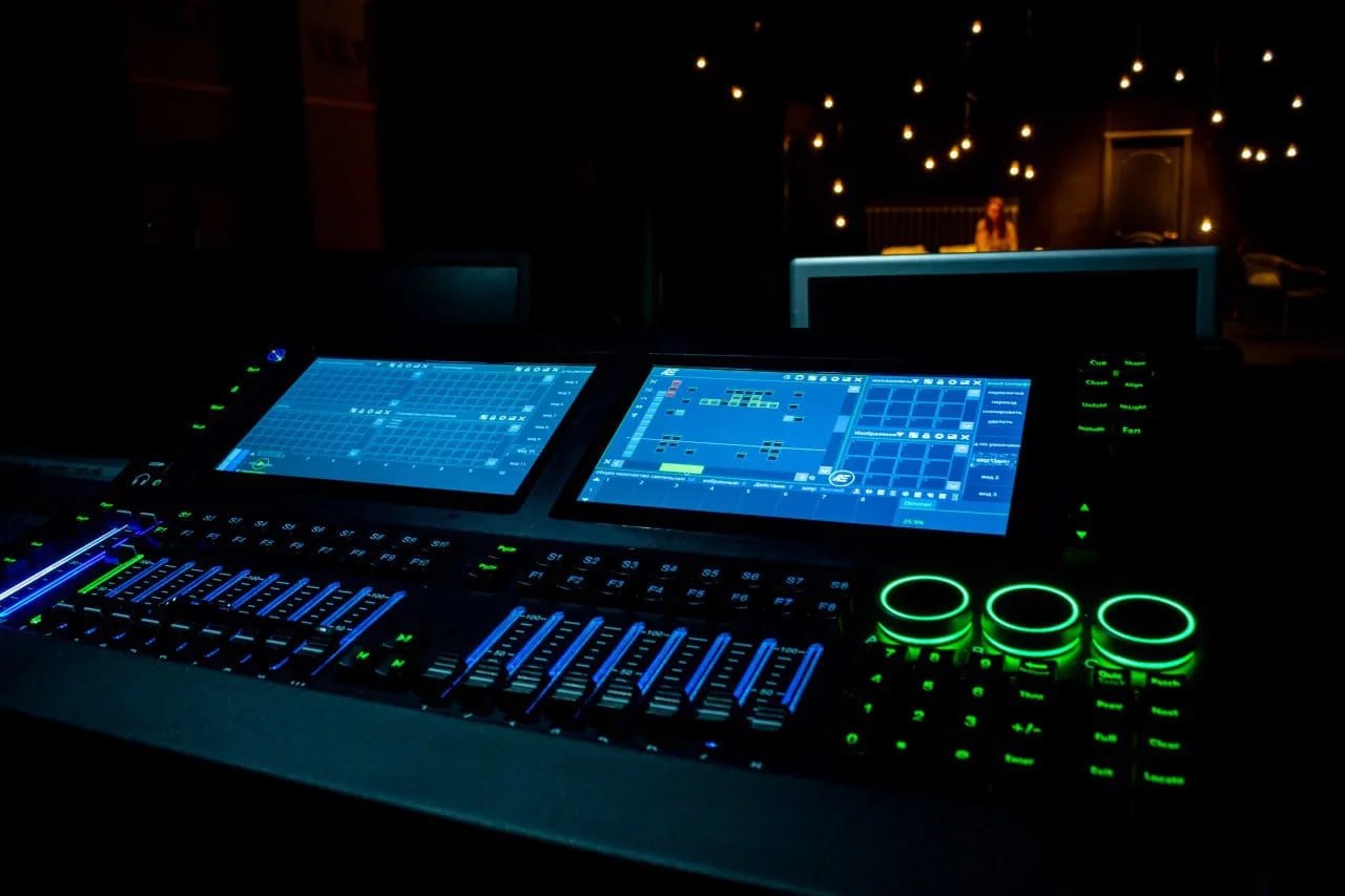 Закупили стейджбоксы, сплиттеры, микшерный пульт, головные микрофоны, светодиодные вращающиеся прожекторы и лазерные проекторы, консоль для управления светом, сценический генератор тяжелого дыма и многое другое.