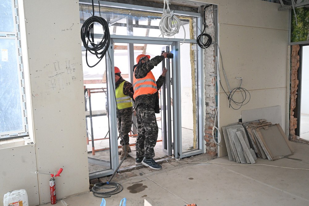 В целом по школе кровельные и фасадные работы выполнены на 90%. Завершены демонтажные работы, оштукатурены стены, установлены новые окна. Специалисты приступили к монтажу вентиляции и инженерных сетей, ремонту классов и пищеблока. Как только позволят погодные условия, начнем благоустраивать пришкольную территорию, на которой будет и спортивная площадка.