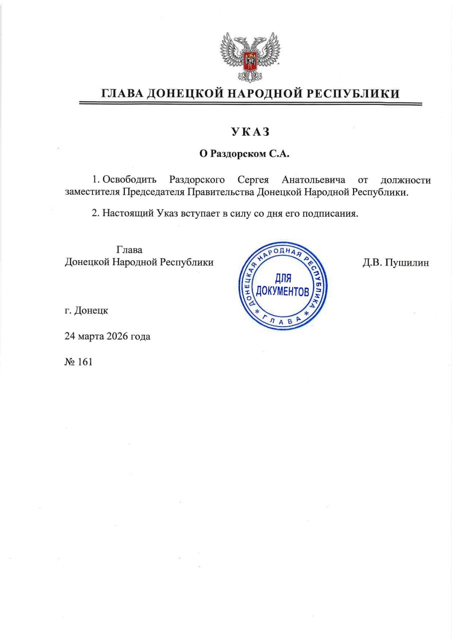 Раздорский Сергей Анатольевич освобожден от должности заместителя Председателя Правительства Донецкой Народной Республики