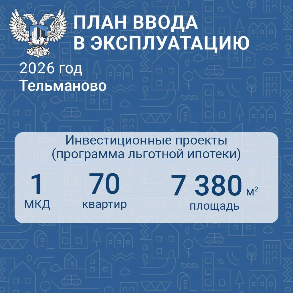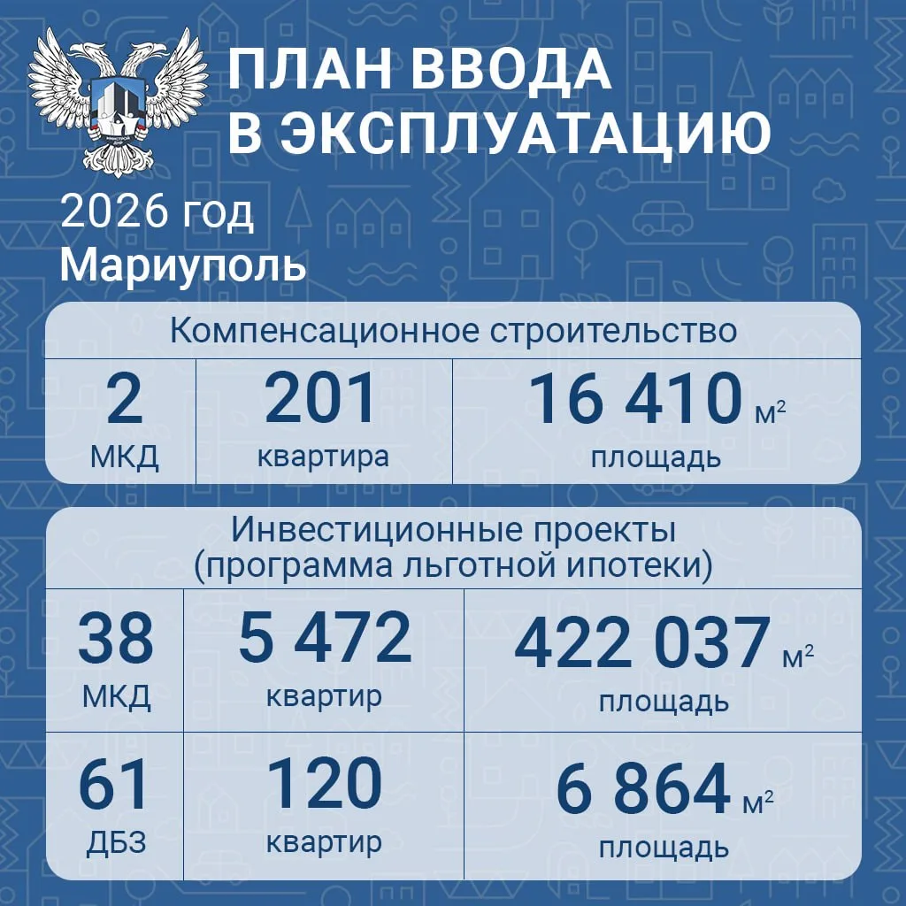 К концу 2026 года в ДНР планируется ввести в эксплуатацию порядка 500 тыс. кв. м жилой площади — это 43 многоквартирных дома и 61 дом блокированной застройки.