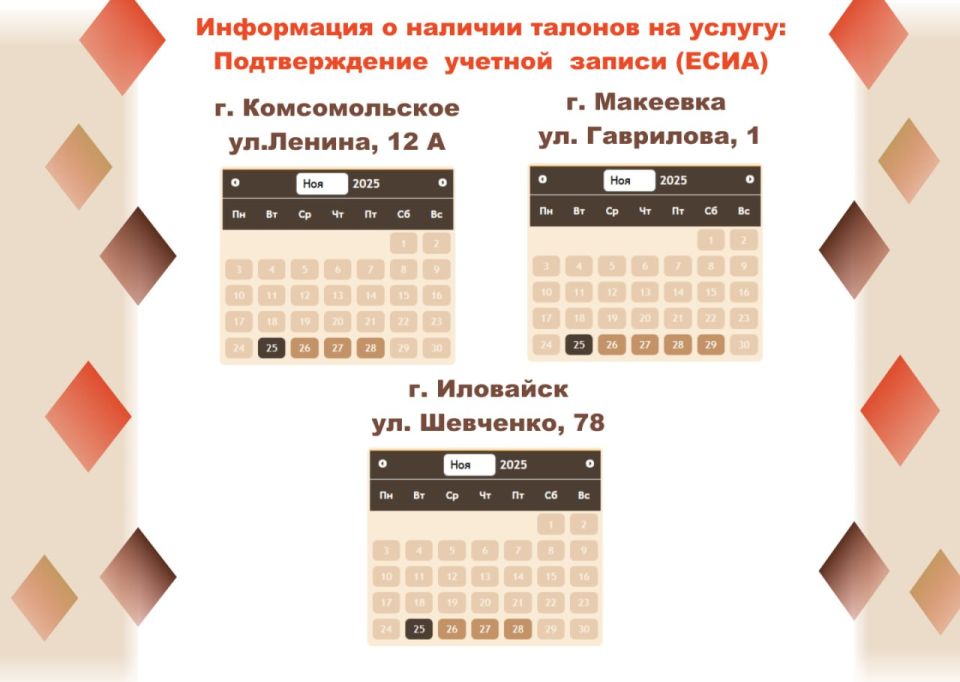 Информацию о доступных талонах на получение необходимых услуг в отделениях МФЦ можно найти в карточкахПеред посещением МФЦ проверьте наличие свободных талонов на Портале ГБУ "МФЦ ДНР".