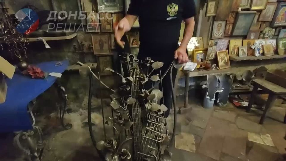 К 45-летию со дня смерти Владимира Высоцкого донецкий кузнец Виктор Михалев сделал металлическую скульптуру в виде увитой розами гитары с нотным станом
