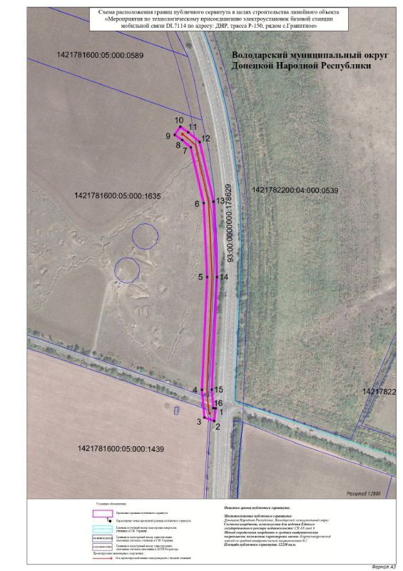строительство линейного объекта «Реализация внешнего электроснабжения базовых станций ГУП ДНР «РОС» (DL7101, DL7102, DL7103, DL7104, DL7105, DL7106, DL7107, DL7108, DL7109, DL7110, DL7111, DL7112, DL7113, DL7114,DL7115, DL7116) трасса Р-150, участок г. Донецк – г. Мариуполь.Базовая станция DL7114».