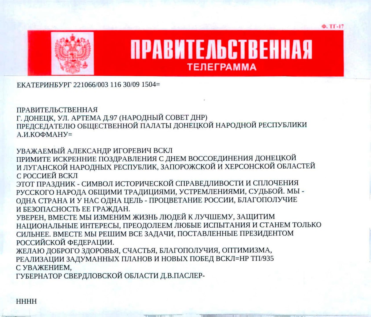 Губернатор Свердловской области Денис Паслер поздравил жителей Донбасса с Днем воссоединения с РФ.