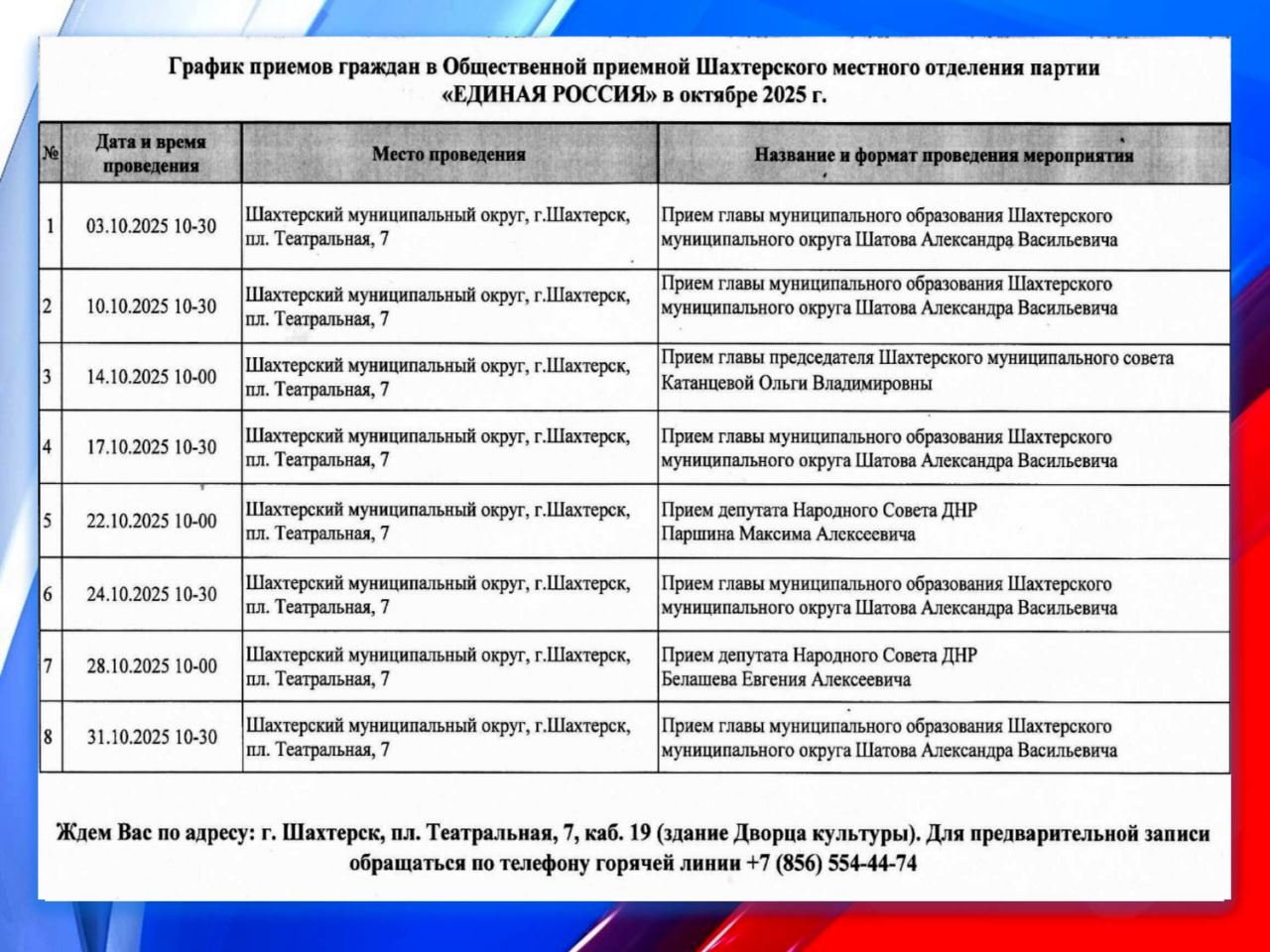 График приемов граждан в местной общественной приемной Шахтерского местного отделения партии «ЕДИНАЯ РОССИЯ» в октябре 2025 года