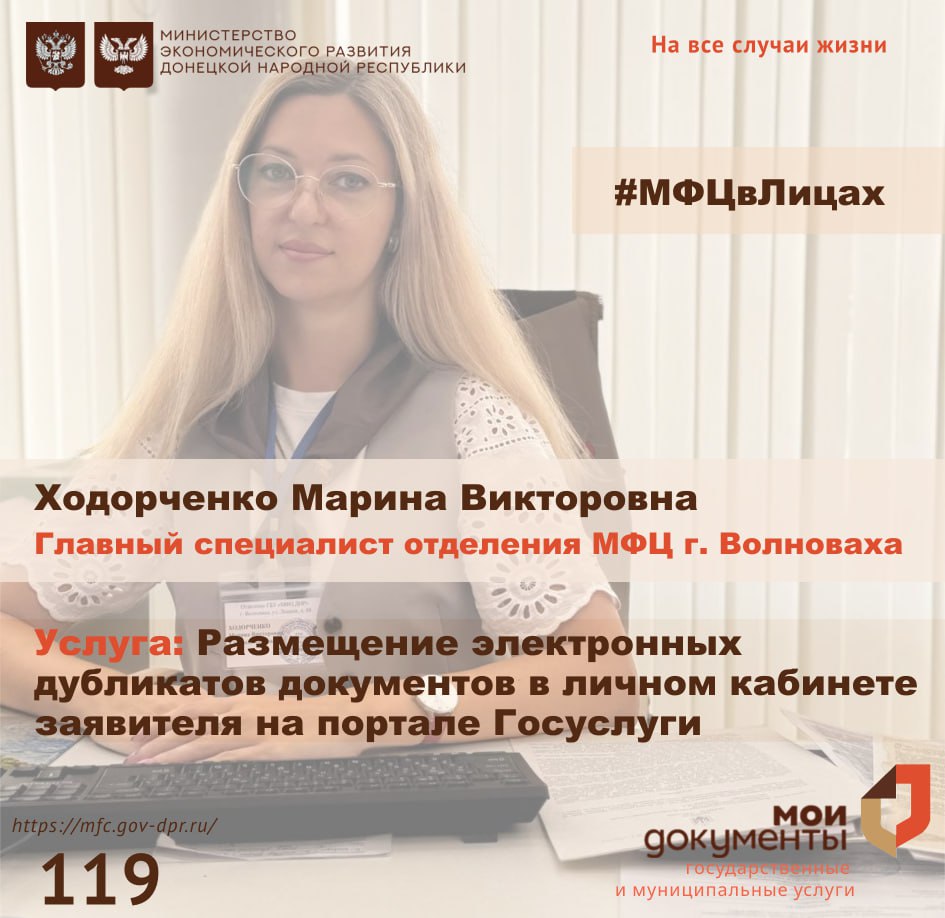 Марина Викторовна – специалист в сфере оказания услуги по размещению электронных дубликатов документов в личном кабинете заявителя на Едином портале государственных и муниципальных услуг (функций) (ЕПГУ)