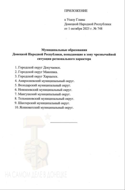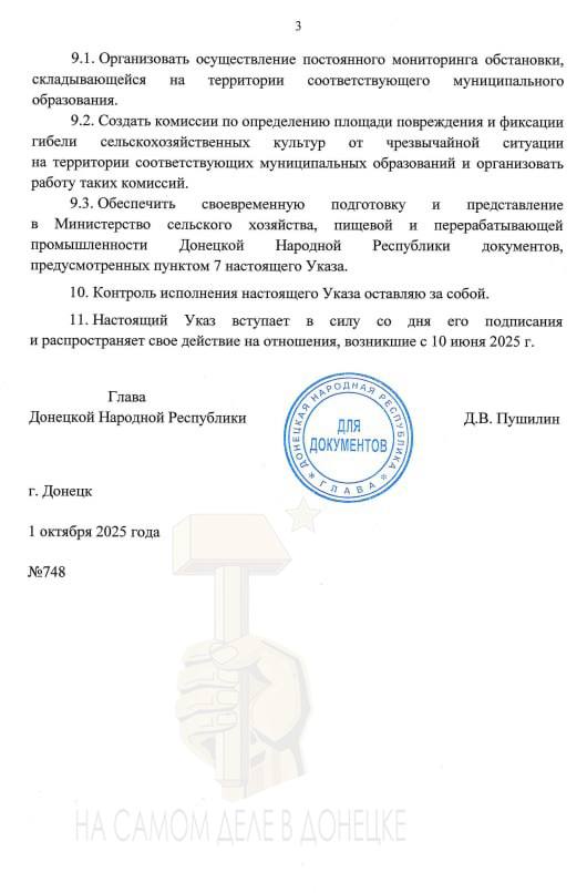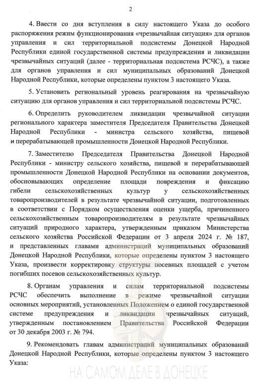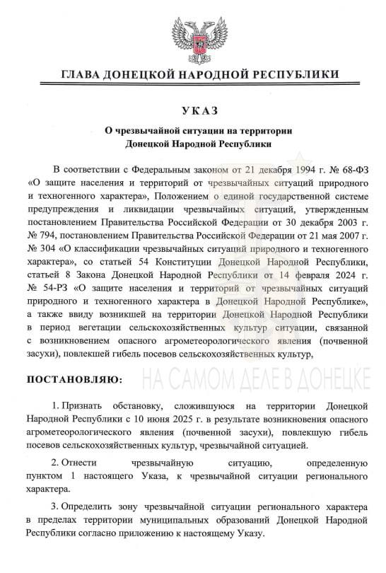 Глава ДНР Денис Пушилин подписал Указ, согласно которому обстановка, сложившаяся на территории ДНР с 10 июня 2025 года в результате возникновения почвенной засухи, повлёкшей гибель посевов сельскохозяйственных культур, признана чрезвычайной ситуацией.