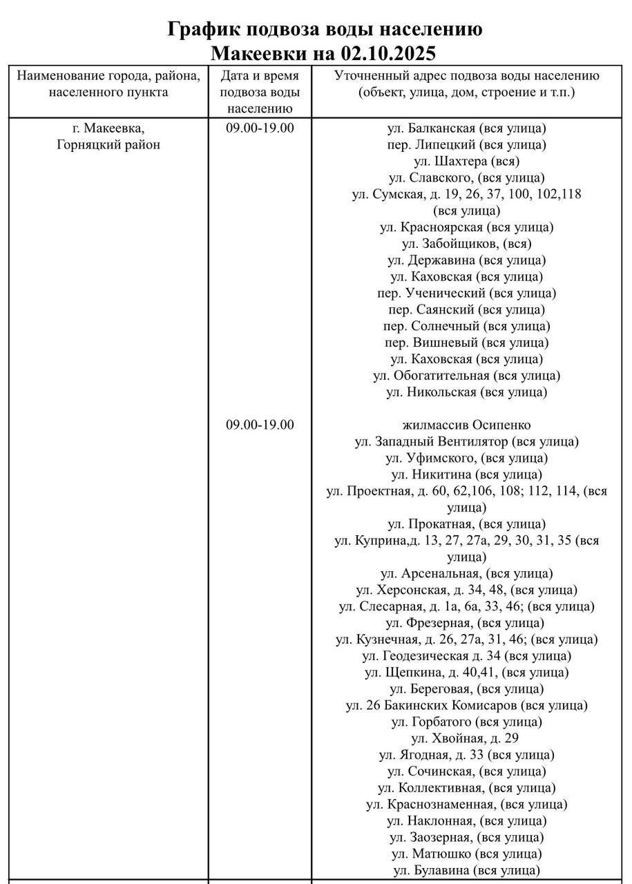 Завтра, 2 октября, планируется подвоз ВОДЫ. Набрать воду можно по адресу: I смена:11:00-13:00 ул. Шахтная, 26, 28, 38,ул. Шахтная 40,10,4,11:00-13:00 ул. Миусская, 1-15,ул. Тиходонская, 10,12,14,24,30,36/2, 38,42,50,11:00-13:00 ул. Красноярская, 10/3...