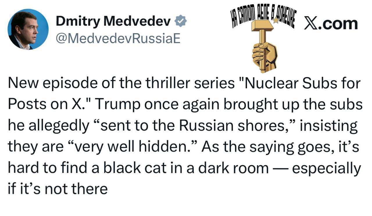 В конце июля Трамп, разочарованный отсутствием молниеносного прогресса в урегулировании (а что он для этого сделал — поставил пластиковые буквы на Аляске?), решил использовать своё привычное оружие — обзывательства в интернете.