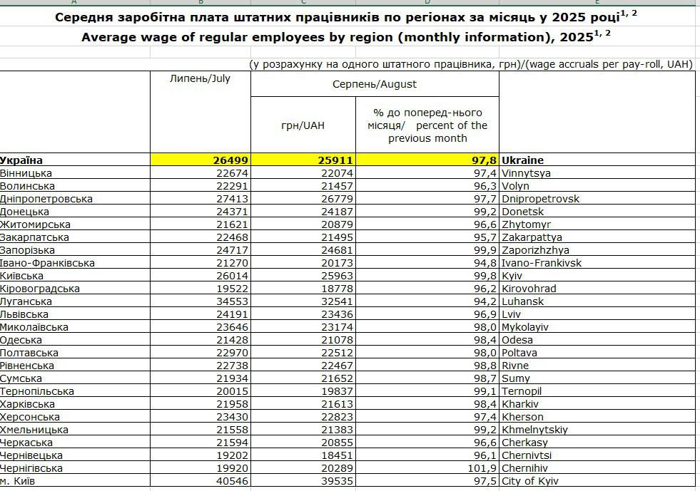 Средняя зарплата по Украине в августе 2025 года сократилась в сравнении с июлем на 2,2% - с 26 499 грн до 25 911 грн, а в Киеве - на 2,5% (с 40 546 грн до 39 535 грн), сообщил Госстат.