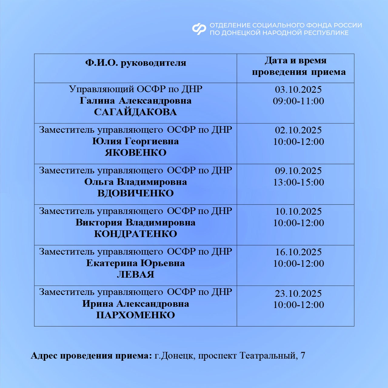 График приема жителей Донецкой Народной Республики руководством регионального Отделения СФР в октябре 2025 года