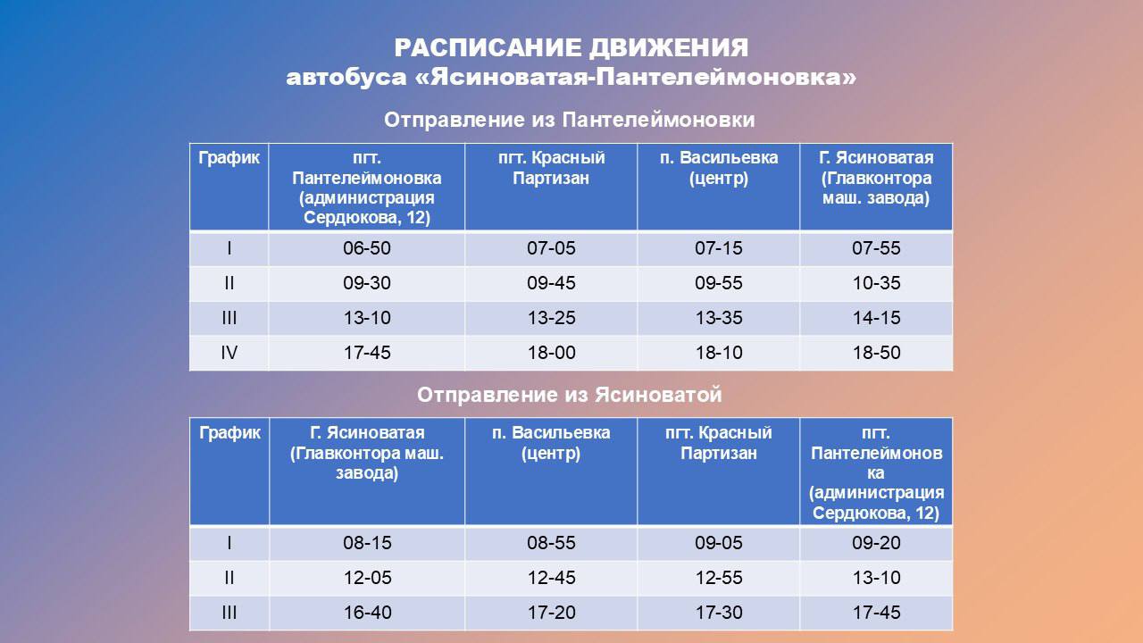 С 03 октября 2025 г. по многочисленным просьбам жителей Ясиноватского округа восстановлено транспортное сообщение между населенными пунктами «г. Ясиноватая – с. Васильевка – пгт. Красный Партизан – пгт. Пантелеймоновка».