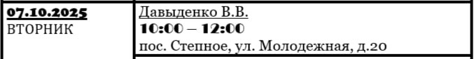 Прием будет осуществляться 07 октября 2025 г. с 14:00 до 16:00.