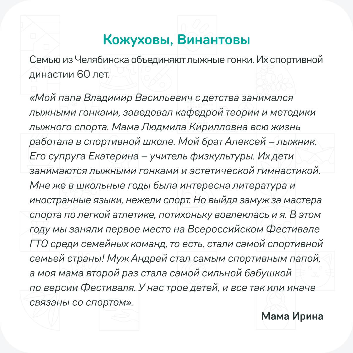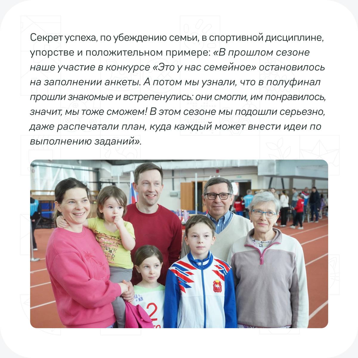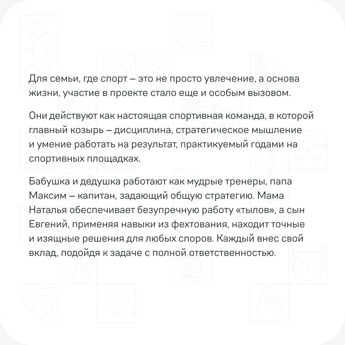 Узнайте, как спортивные династии участников конкурса «Это у нас семейное» применяют свои секреты успеха в заданиях дистанционного этапа, в наших карточках!