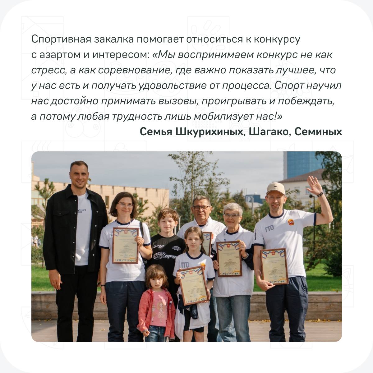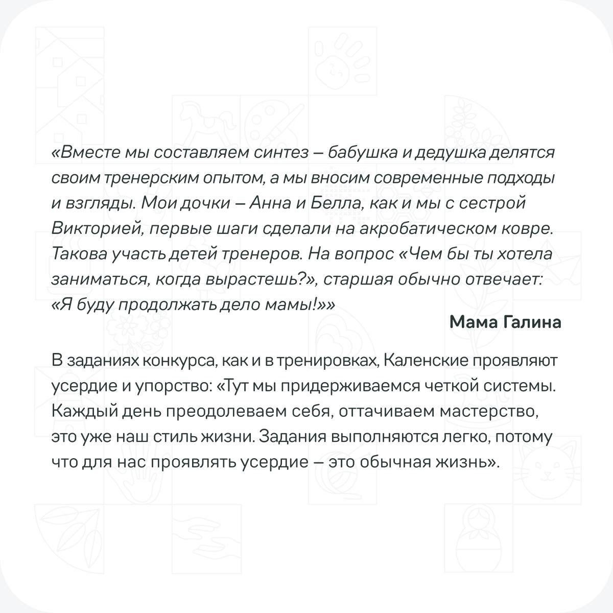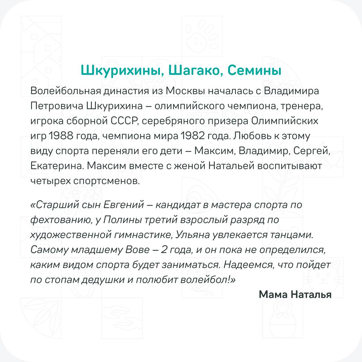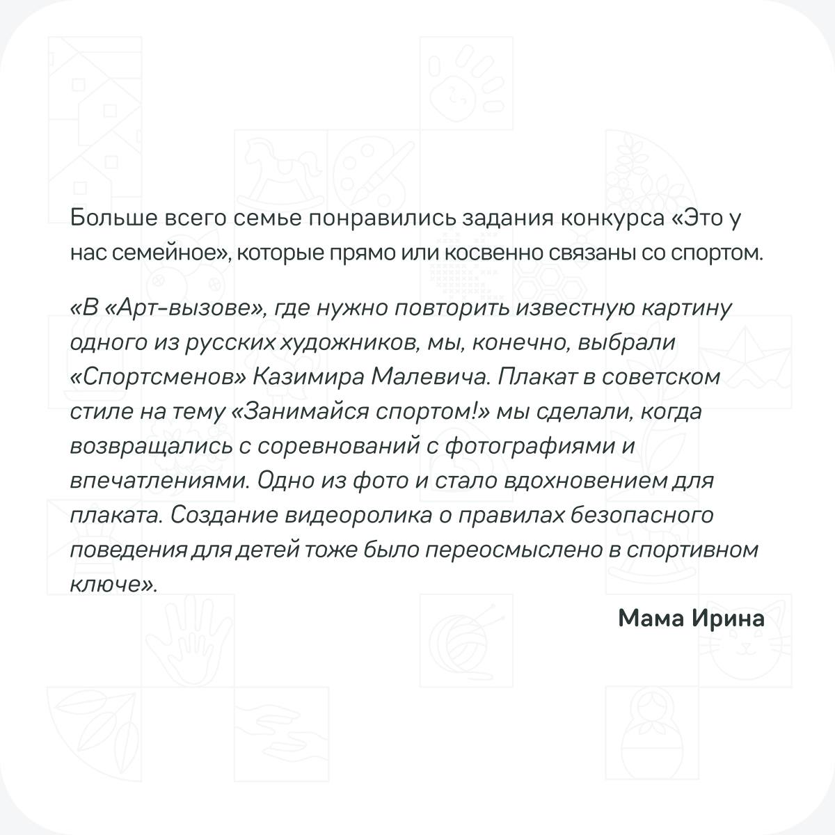 Узнайте, как спортивные династии участников конкурса «Это у нас семейное» применяют свои секреты успеха в заданиях дистанционного этапа, в наших карточках!